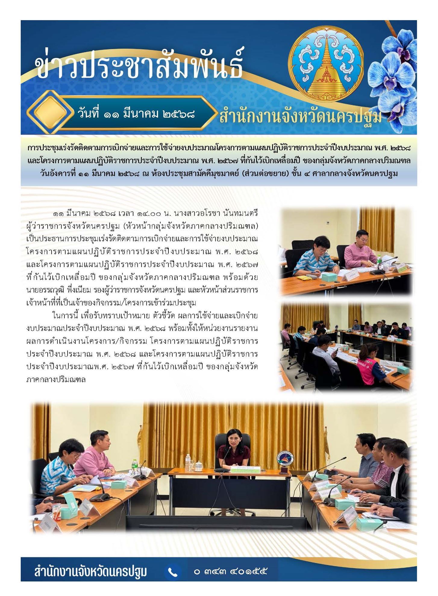 11 มีนาคม 2568 เวลา 14.00 น. นางสาวอโรชา นันทมนตรี ผู้ว่าราชการจังหวัดนครปฐม (หัวหน้ากลุ่มจังหวัดภาคกลางปริมณฑล) เป็นประธานการประชุมเร่งรัดติดตามการเบิกจ่ายและการใช้จ่ายงบประมาณโครงการตามแผนปฏิบัติราชการประจำปีงบประมาณ พ.ศ. 2568 และโครงการตามแผนปฏิบัติราชการประจำปีงบประมาณ พ.ศ. 2567 ที่กันไว้เบิกเหลื่อมปี ของกลุ่มจังหวัดภาคกลางปริมณฑล พร้อมด้วยนายอรรถวุฒิ พึ่งเนียม รองผู้ว่าราชการจังหวัดนครปฐม และหัวหน้าส่วนราชการ เจ้าหน้าที่ที่เป็นเจ้าของกิจกรรม/โครงการเข้าร่วมประชุม